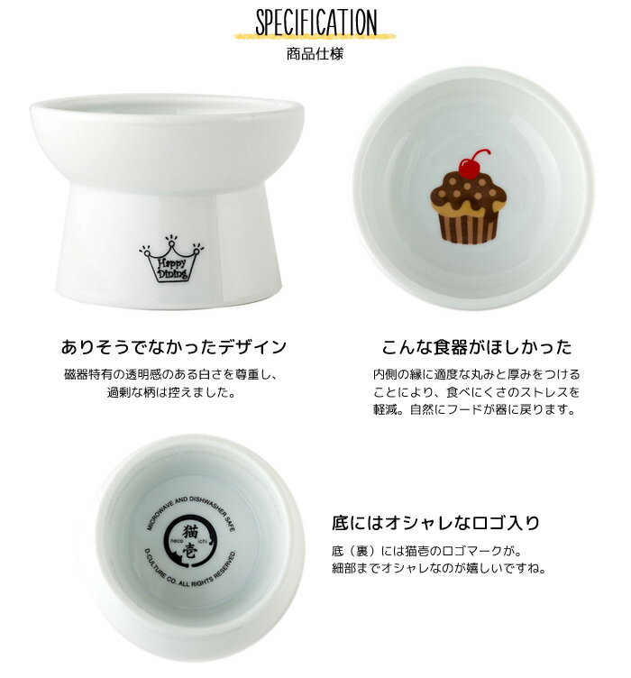 ●器部分:直径11cm 深さ3cm ●足部分:直径9cm 高さ4cm ●全体サイズ: 幅11×奥行11×高さ7.5cm ●本体重量:295g●磁器製猫壱 ハッピーダイニング 脚付フードボウル カップケーキ 猫がいちばん食べやすい姿勢をキープできる食器! ハッピーダイニング・プロジェクトにあたり、猫壱では多くのネコへのリサーチを重ね、ネコにとって快適な形状の食器を開発することに成功しました。
