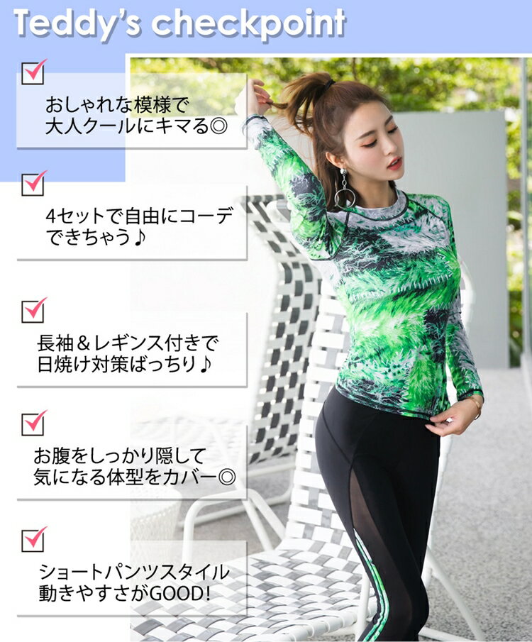 レディース フィットネス水着 2colors ブラ+ショーツ+ラッシュガード+レギンス 4点セット 動きやすいデザインなので、 フィットネスウェアとしてもおすすめ! ジムでも大活躍間違いなし♪