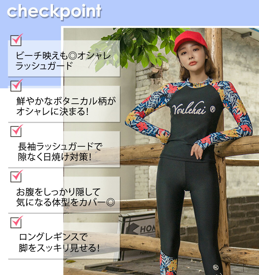 MIZUGI SIZE M(7号) L(9号) XL(11号) トップバスト 72-80 79-87 86-94 アンダーバスト 60-67 65-72 70-77 ブラカップ Aカップ/Bカップ/Cカップ Bカップ/Cカップ/Dカップ Cカップ/Dカップ/Eカップ ウエスト 58-64 64-70 69-77 ヒップ 82-90 87-95 92-100 着丈 52 54 56 パンツ丈 82 85 88 【商品詳細】 セット内容 ・3点セット ・ラッシュガード ・ショーツ ・レギンスパンツ 商品紹介 レディース フィットネス水着 3点セット 長袖ラッシュガード ショーツ レギンス ─ Teddy's checkpoint ─ ・ビーチ映えも◎オシャレラッシュガード ・鮮やかなボタニカル柄がオシャレに決まる! ・長袖ラッシュガードで隙なく日焼け対策! ・お腹をしっかり隠して気になる体型をカバー◎ ・ロングレギンスで脚をスッキリ見せる! ─ Detail ─ ・嬉しい!パッドつき☆