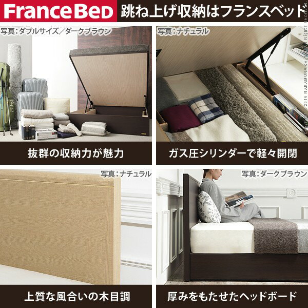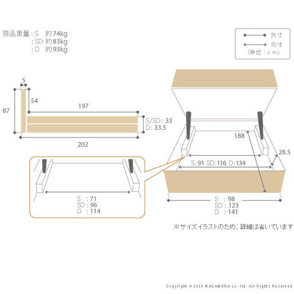 ●安心のメーカー2年保証【カラーバリエーション】ダークブラウン・ミディアムブラウン・ナチュラル【仕様】本体:プリント紙化粧合板床板:プリント紙化粧合板跳ね上げ収納:ガススプリング◎組立品【サイズ】外寸:幅141x奥行202x高さ87cm重量:約93kg床面高さ:33.5cm床面サイズ:幅141x奥行197cm床面から宮上まで高さ:53.5cm宮奥行:5cm跳ね上げ収納サイズ:幅134/114x奥行188x高さ28.5cm株式会社ナカムラ(61400163)